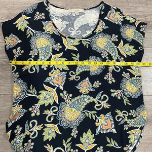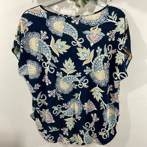 LOFT Navy Paisley Print Cap Sleeve Mixed Media Blouse in size XS. Excellent condition. Front is a lightweight polyester fabric with the back a knit rayon in the same pattern, rounded hem. Please see photos for approximate measurements and details. Item may show a difference in color based upon photography and perception. Photos are part of the description, as everyone’s level of condition may vary. From smoke free and pet free home. All packages are shipped the same or next business day.