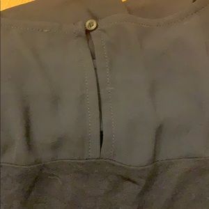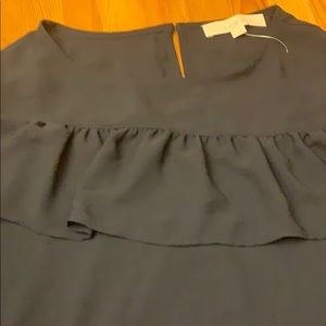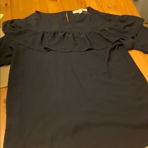 Elegant navy top with ruffle detail. Perfect for casual or formal wear.