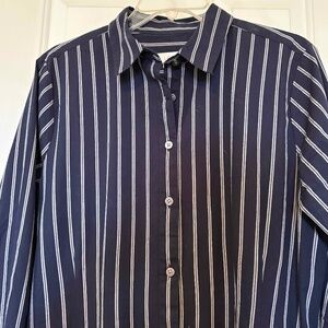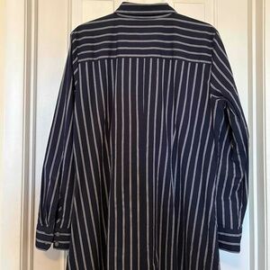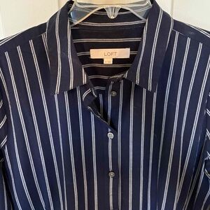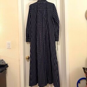 LOFT Navy Stretch Cotton Maxi Dress Size 12 - Light gray pinstripe, long sleeves, fit & flare shape, stretch cotton poplin. POCKETS! Super comfortable and versatile. Shoulder to shoulder 16", pit to pit 21", approx. 54” long from shoulder to hem. NWOT.