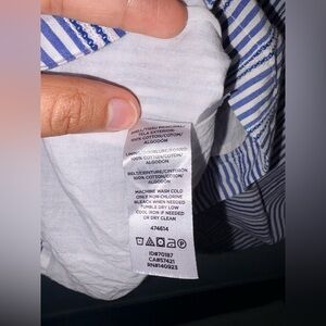 Loft Navy/White Striped midi dress. Features a sleeveless design and tie waist. Perfect for versatile styling.