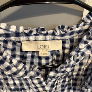 LOFT Navy & White Gingham Ruffle Button-Up Shell