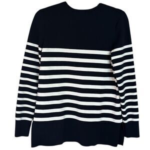 LOFT Navy and White Crew Neck Sweater Nautical Stripes Button Detail Size Medium