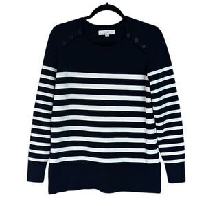 Embrace a classic nautical look with this LOFT sweater, featuring bold navy and white stripes. The crew neckline and medium-weight knit make it perfect for casual wear, offering both style and comfort. The button detail at the shoulders add a fun touch. Like New