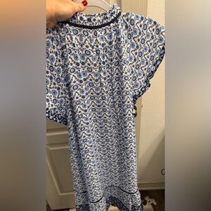 Stylish midi dress with navy and white floral design. Features flutter sleeves and a ruffled hem.