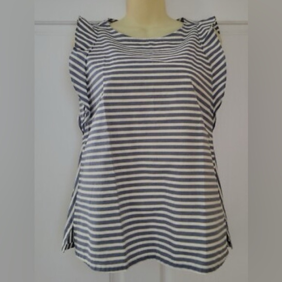 Stylish navy and white striped tank top. Sleeveless design. Perfect for casual outings.