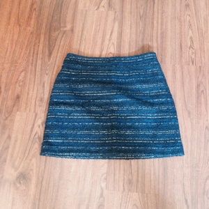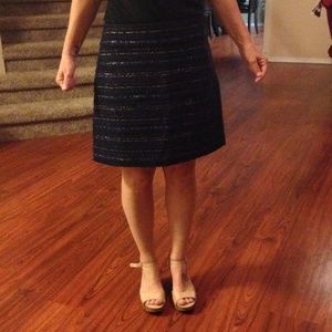 Size 6 skirt from the LOFT. NWOT. The skirt has a black liner underneath the wool that is about an inch shorter than the skirt. Navy colored with beautiful shiny gold stitching throughout. Falls just around the knee on me and I'm 5'4" for reference.