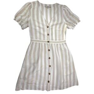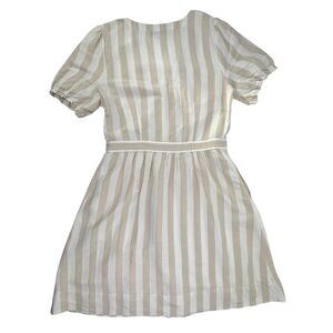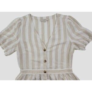 LOFT Neutral Beige Stripe Linen Dress Button Front Knee Length Puff Sleeve 8