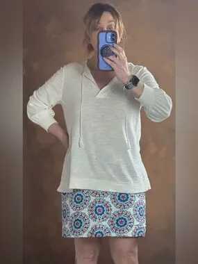 Soft ribbed knit fabric. Mandarin neckline. Long sleeves with relaxed fit. Neutral versatile style.