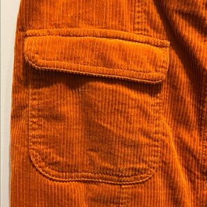 Vibrant orange corduroy skirt. Features button front and flap pockets. Stylish and versatile. Excellent used condition measures 18.5’ across top of skirt. It falls at my knees and I’m 57 measures 20 inches in length.