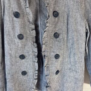 LOFT Outlet Blue Chambray Cotton/Linen Blend Open Jacket Ruffle Trim Sz S