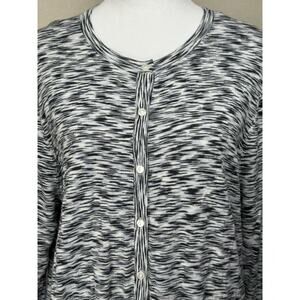 This LOFT Outlet cardigan is a stylish and versatile addition to any woman's wardrobe. Made from 100% cotton knit fabric, it features a classic black and white color scheme with a crew neck and long sleeves, making it suitable for various occasions such as workwear, casual outings, or even parties. The button-up style adds a touch of sophistication, while the lightweight and breathable design ensures comfort for all seasons. Perfect for the fall, winter, or spring, this XL women's cardigan is a timeless piece that can be easily machine washed for convenience.