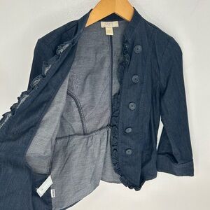 LOFT Outlet Denim Jacket Size XS Ruffle Trim Coat Blue Jean Open Cardigan