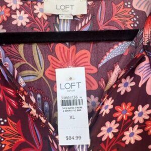 This LOFT Outlet women’s floral mini dress is the perfect piece for fall, winter, or spring style. Designed in a rich burgundy and red floral print with pops of pink and lavender, this dress combines comfort, color, and effortless femininity.