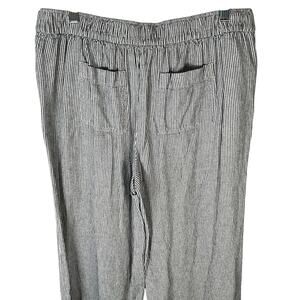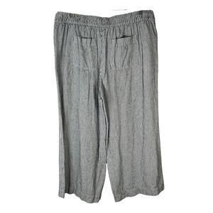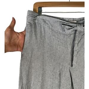LOFT Outlet women’s wide-leg cropped pants in a black and white micro-stripe pattern. Size Large. Features include a tie-waist belt, slip-on elastic back waistband, side pockets, back welt pockets, and breathable linen-blend fabric. Excellent condition, no flaws.