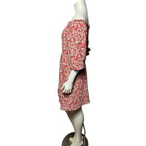 Stunning LOFT Outlet floral dress featuring a vibrant red, coral pink, yellow, and white floral pattern on a dark background. This versatile piece showcases an elastic off-shoulder neckline that can also be worn as a scoop neck. The dress has practical 3/4 puff sleeves with elastic cuffs and a flattering elastic waistband that creates a feminine silhouette. The lightweight fabric drapes beautifully in an A-line style, falling to a modest above-knee length. Perfect for spring and summer occasions, this dress combines cottage core charm with modern versatility. Made in Indonesia, this dress is in excellent used condition with no visible flaws. Ideal for brunches, garden parties, or casual outings when paired with sandals or wedges. approx. measurements taken laying flat and undoubled: