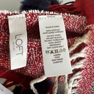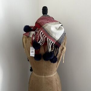 New with tags LOFT Outlet Plaid Scarf with Faux Fur Poms 79" X 28" Soft Red Navy Cream