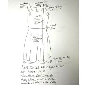 LOFT Outlet Wht Eyelet Lace Wms Shift Dress Sz 8 Fully Lined, sleeveless, back invisible zipper, 100% Cotton Washable Hang Dry Cool Iron. Preowned Gently Worn, no torn seams, ripped fabric, stains or repairs. Garment Measurements Diagram in photos. Easy wear style, perfect summer dress.
