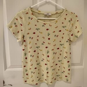 Charming short sleeve top with a colorful fruit pattern. Perfect for casual wear. Love the heart design/softness of this shirt. it's a nice shade of yellow. Although it is a XS it fits more like a S. Gently used - hardly worn and without visible flaws.