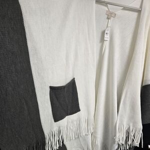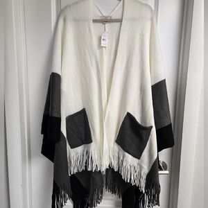 NWT LOFT Colorblock Shawl. Stay cozy and stylish with this colorblock fringe shawl. Perfect for layering, this sweater features a chic combination of black, gray, and cream. Ideal for any girl that gets cold easily. Has pockets!