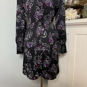 LOFT Paisley Smocked Flared Long Sleeve Floral Dress Black Purple White 8