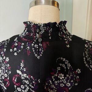 LOFT Paisley Smocked Flared Long Sleeve Floral Dress. Smocked neckline and cuffs. Pretty floral print in white, pink and purple on a solid black background. Fully lined. Perfect for the office or a fall and winter party!