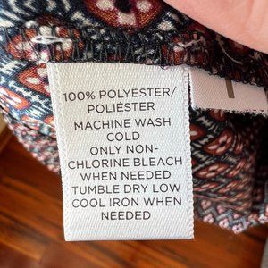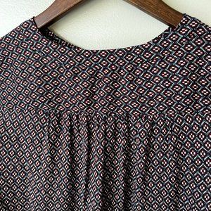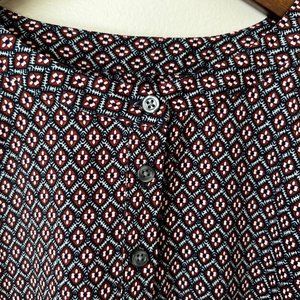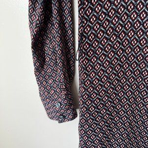 LOFT Petite shirt dress with Navy background and burgundy/grey pattern. Round, five button neck. Waist has side belt loops (belt not included). Sleeves include buttons for wearing rolled up. Great condition.