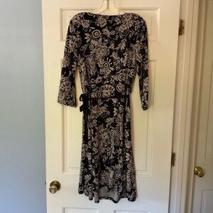 LOFT Petite Wrap Dress Black Tan Floral Ribbon Tie V Neck 3/4 Sleeve Sz 14P NWT