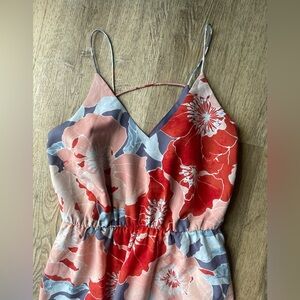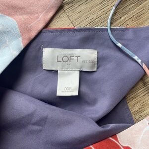 Gorgeous LOFT Petites sleeveless maxi dress featuring an oversized floral print in vibrant red, blush pink, periwinkle, and soft blue on a lightweight, flowy fabric. Designed with a flattering V-neckline, thin adjustable straps, and an elastic waist for all-day comfort. Perfect for spring/summer weddings, garden parties, or vacation dinners. Petite 00P for a tailored fit.