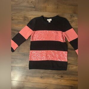 This LOFT Petites black and coral striped sweater adds the perfect pop of sparkle to your cold-weather wardrobe! Made from 100% cotton, this midweight knit features shimmering sequin detailing on the coral stripes, creating a fun yet sophisticated look. Ideal for holiday gatherings, girls’ nights, or simply brightening up a chilly day.