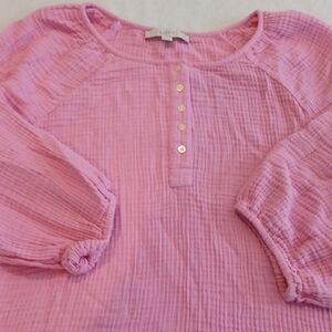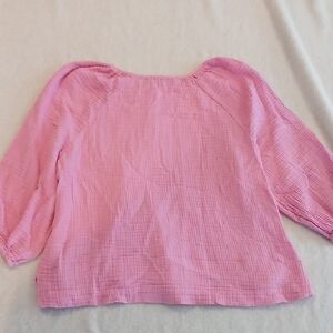 This pink blouse from LOFT is crafted from a lightweight, textured fabric, offering a relaxed and comfortable fit. The 3/4 length sleeves add a touch of volume, making it a versatile piece for everyday wear. Its soft, muted pink shade and straight hemline enhance its classic appeal.