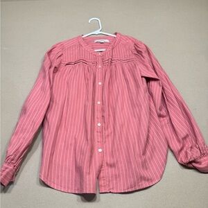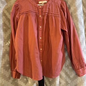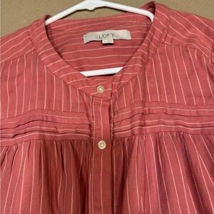 This relaxed pink blouse from LOFT features a stylish bib collar and long cuffed sleeves, perfect for a polished yet comfortable look. The button-down design adds a classic touch, making it a versatile addition to any wardrobe.
