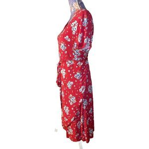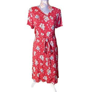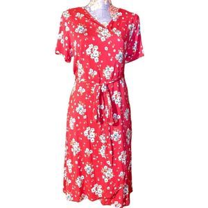 Charming pink wrap midi dress. Features floral pattern. Short sleeves and tie waist. Perfect for any occasion.
