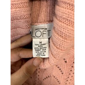 LOFT Pink Lambswool Angora Blend Cable Knit Turtleneck Sweater Size Medium Beautiful lambs wool and angora sweater Tagged size medium, looks like it needs to be blocked and stretched Measurements (flat, approx.): Pit to pit: 16" Length: 22"