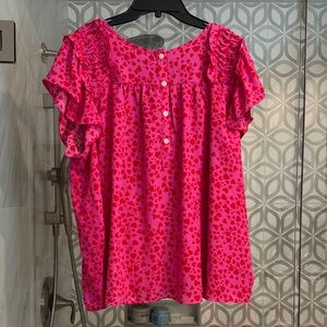 Chic pink blouse with playful patterns. Features ruffled sleeves and button details. Ideal for casual outings.