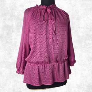 Keywords: LOFT ruffle blouse, peplum top XL, pink polka dot shirt, romantic workwear, cottagecore blouse
