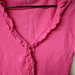 Chic pink cardigan with ruffled trim. Ideal for layering. Soft and stylish.