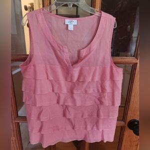 This pink tank blouse from LOFT features a charming ruffled design, perfect for adding a feminine touch to your outfit. The sleeveless style and lightweight fabric make it ideal for warm weather, while the tiered ruffles create a playful and elegant look.