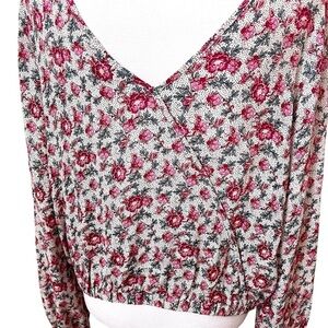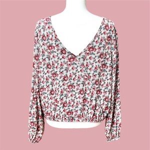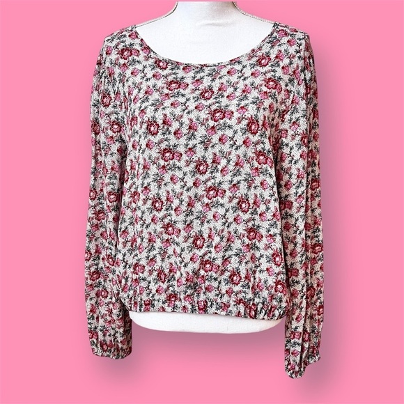 Pretty LOFT Pink & White Floral Pullover Top / Blouse; loose fit with soft lightweight material, scoop neckline, deep V back, long sleeves, elastic cuffs and waistband, size M in Like New condition.