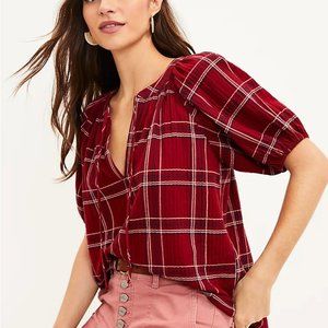 LOFT Plaid Tie Neck Puff Sleeve Top