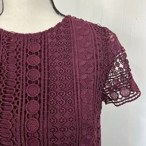 Size 2P, 2 petite. Eggplant plum purple color. Round neck. Zip closure at back with hook and loop clasp. Geometric and floral patterned crochet guipure lace overlay. Ruffle hem. Fully lined shift dress. Fabric blend is 100% polyester.