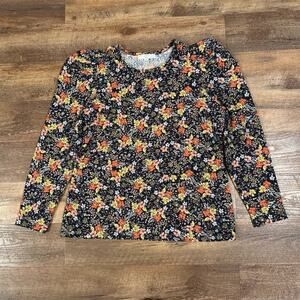 This blouse is in great pre-owned condition. It has a vibrant orange and yellow floral print on a rich navy background. It's super pretty and textured but also seems like it would wear like a comfortable long-sleeved t-shirt.