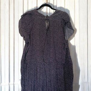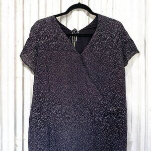 LOFT short sleeve jumpsuit in tiny black & white dot print lined fabric that is so versatile and can easily be dressed up or down. Cross over bust with metal snap for extra security. Short flutter sleeves and key hole feature in back with ties. Side pockets add a nice touch. Size 20. Excellent preowned condition. Photos are part of the description, please zoom in for more details.