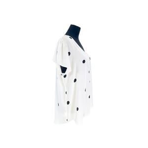 This white blouse features classic black polka dots and flutter sleeves, creating a look that's both stylish and fun. The v-neckline with button detail adds a touch of elegance, making it perfect for work or weekend outings.