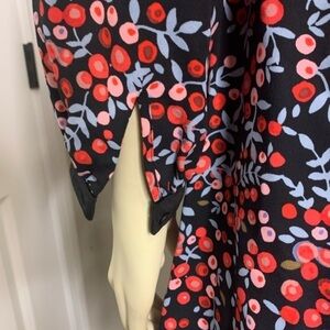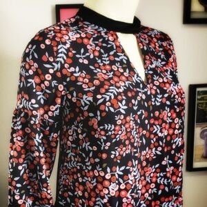 Preloved Loft Dress. This dress has fun velvet hem on the bottom, sleeves and collar neck. Fun puffer sleeves and a beautiful floral design. Zipper on the back goes low for a comfortable fit. True to fit. Beautiful and elegant, A shape, long sleeves, 100% polyester. This dress is out of stock.