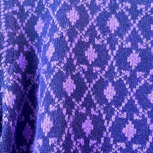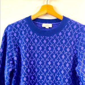 This LOFT sweater showcases a vibrant purple hue and a classic crewneck style, highlighted by an intricate geometric textured pattern. The smooth cuffs, waistband, and neckline offer a refined contrast, making it a versatile addition to any wardrobe.