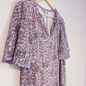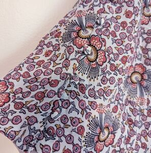 I love the design on this. There are so many details hidden among the patterns. Like the covered buttons on the sleeves and the little embroidered eyelets on the neckline. The sleeves are wide and drape so flatteringly.