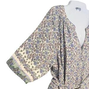 LOFT Purple Floral Print Linen Blend V-Neck Belted Elbow Sleeve Dress Sz L