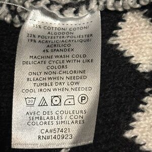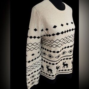 Crew neck cream and black , stretchy knit with 4% spandex, heavyweight, cozy, warm , novelty reindeer print. Pre-owned in good condition, machine washable. Such a cute sweater that you can dress up or down. Perfect for those ski trips!!