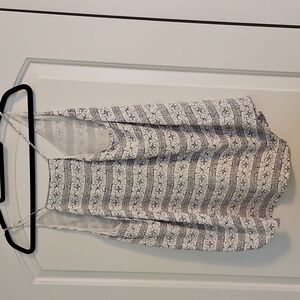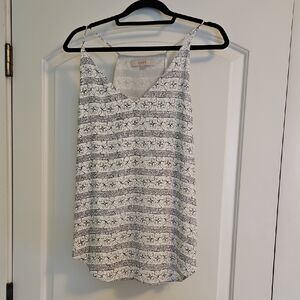 Perfect tank for layering! Feminine, flowy, lined razorback tank. Off white and soft black print.