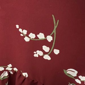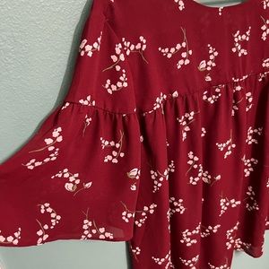 Maroon/dark red. Pictures look brighter red then actually is. Love the flow of the sleeves and fits comfortable. Top part if more blouse like and bottom has t-shirt feel.